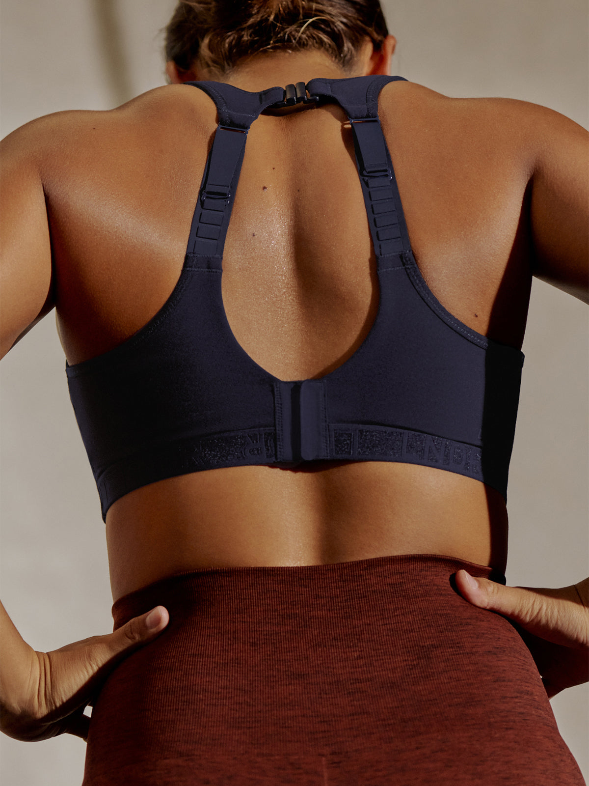 This bra has a unique internal "no bounce" layer that locks the girls down while maintaining shape and definition. It also features fixed adjustable straps, so it doesn't loosen over time during your workout, and a secondary back clasp to ensure maximum support in all directions. The branded elastic along back edge maintains a high level of stretch to mitigate digging in without losing support and there's padded straps for extra comfort.